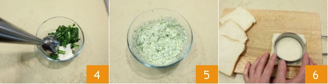 Quando le erbette saranno cotte lasciatele intiepidire, poi ponetele in una ciotola con la ricotta, frullate tutto insieme con il mixer ad immersione (4) fino ad ottenere una crema omogenea (5). Ora prendete le fette di pancarrè e con dei coppapasta ricavate 4 dischi (6):