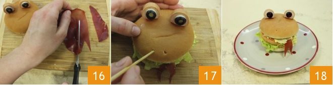 A parte tagliate con le forbici sei striscioline di bresaola con una doppia punta in modo da ricreare la lingua del ranocchio (16). Per finire adagiate l’altra metà del pane sul burger e con uno stecchino create due piccoli fori sotto gli occhi per ricreare le narici dell’animale (17). Il vostro hamburger ranocchia è pronto per sorprendere i vostri bimbi (18)!