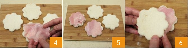 Adagiate il prosciutto cotto (4-5) e ricoprite con l’altra metà di pancarrè (6).