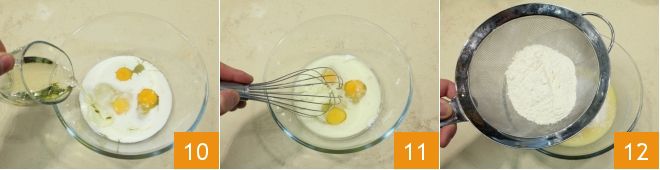 In una ciotola rompete 3 uova, aggiungete il latte e l'olio di semi (10). Sbattete il composto con una frusta a mano (11) e successivamente unite la farina e il lievito setacciandoli con un colino a maglie strette (12).
