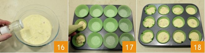 Aggiustate di sale e versate il composto in una sac-à-poche. Foderate uno stampo da muffin con dei pirottini di carta colorati e riempite ciascun pirottino fino a 2/3 dell' altezza (17-18). Cuocete i cupcake in frono ventilato a 180° per 20-25minuti.